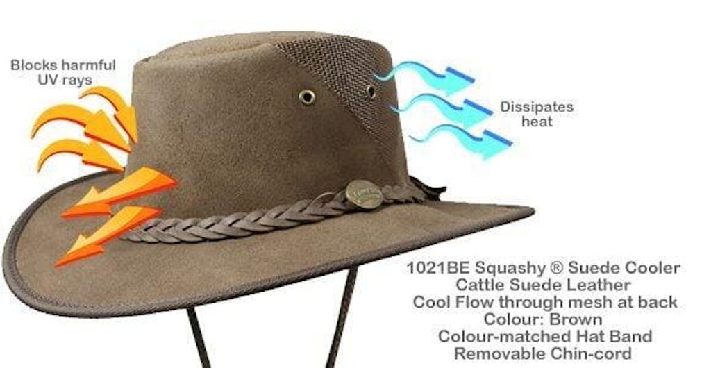 This Barmah 1021 Squashy Suede Cooler is a durable cattle suede leather adventurer hat. This hat is completely foldable, lightweight and showerproof. It has a unique flow-through mesh at the back of the crown for air flow and a detachable chin strap.
